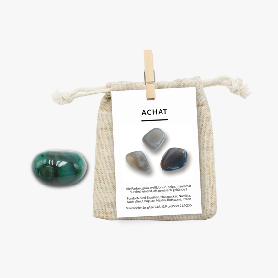 Zur optimalen Aufbewahrung wird der grüne Achat-Trommelstein in einem Natur-Jutebeutel geschützt. Eine ausführliche Beschreibungskarte wird mitgeliefert. Auf dieser sind allgemeine Informationen sowie die Heilwirkungen auf Körper, Geist und Seele gut zum Immer-wieder-Nachlesen zusammengefasst.