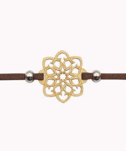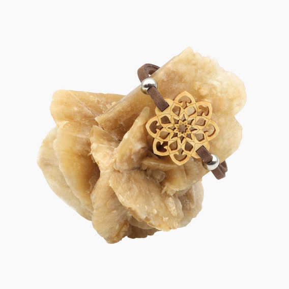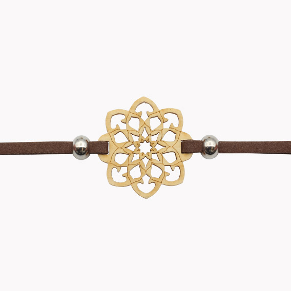 Das Armband besteht aus einem Textilband und dem Schmucksymbol Mandala aus Zirben-Holz.