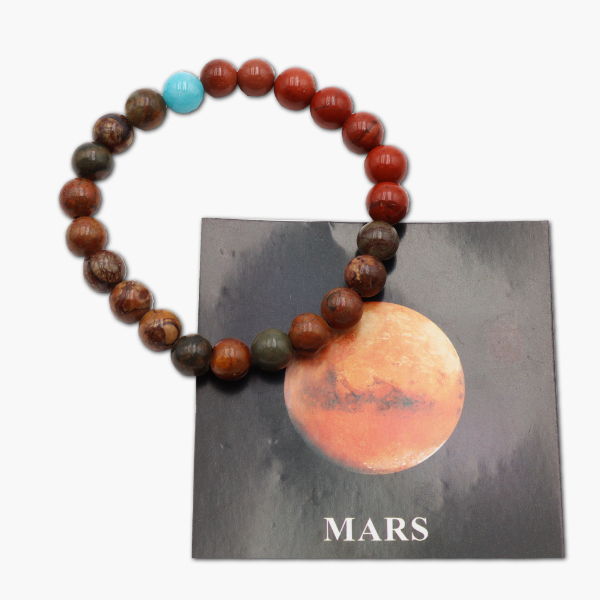 Das kräftige rot-braune Planetenarmband „Mars“ aus hochwertigen Edelsteinen fängt die Energie des roten Planeten ein. Es symbolisiert den freudigen Charakter von Mars und verbindet die kosmischen Energien des Universums.