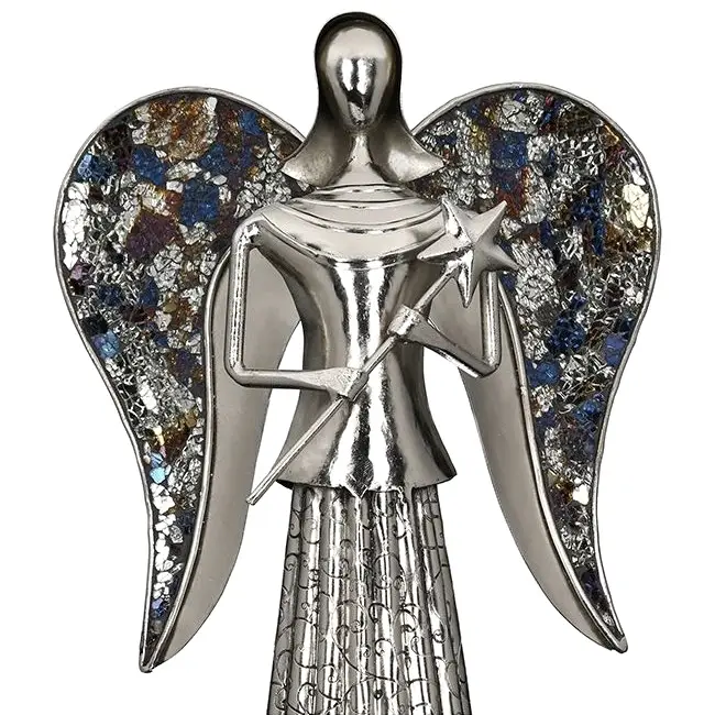 Entdecken Sie die zauberhafte Metallfigur Engel MURIEL in Silber – ein wahres Highlight Ihrer Weihnachtsdekoration! Mit einer Höhe von 82 cm bzw. 60 cm wird dieser exquisite Engel zum strahlenden Mittelpunkt jeder festlichen Gestaltung. Die kunstvoll gestalteten Flügel aus farbigem Glas reflektieren das Licht auf atemberaubende Weise und schaffen einen wunderschönen Effekt, der Ihre Gäste verzaubern wird. Das Kleid des Engels besticht durch ein unbeschreiblich schönes Spiralmuster, das ihm eine elegante Note verleiht. In seiner Hand hält MURIEL einen imposanten Sternenstab, der Ihnen und Ihren Liebsten die Erfüllung aller Weihnachtswünsche verspricht. Holen Sie sich diesen einzigartigen Engel nach Hause und genießen Sie die festliche Atmosphäre – perfekt für anspruchsvolle Kunden, die das Besondere schätzen!